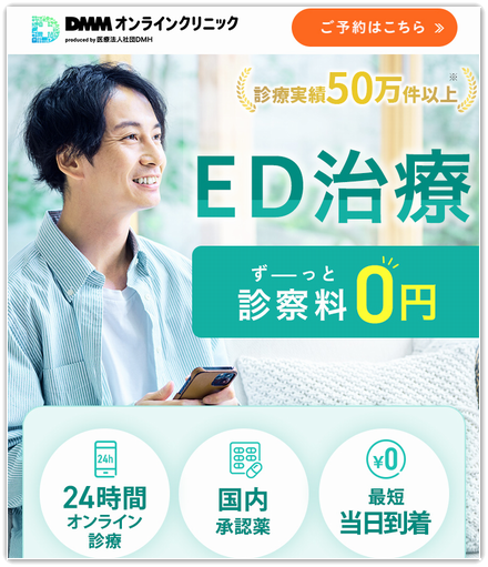 中折がひどすぎる、勃起時間をもっと延ばしたい、とにかく硬さがほしい…なら「安くED薬が手に入る」DMMオンラインクリニックがおすすめです。