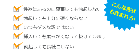 ですので、次のような症状があれば、ED(勃起不全)であり、少なからずとも中等度型EDと言えます。