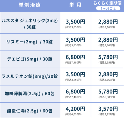 また、とにかく安くはじめてみたいという場合であれば、睡眠薬だけの単剤プラン「睡眠リズム改善プラン」も良心的です。