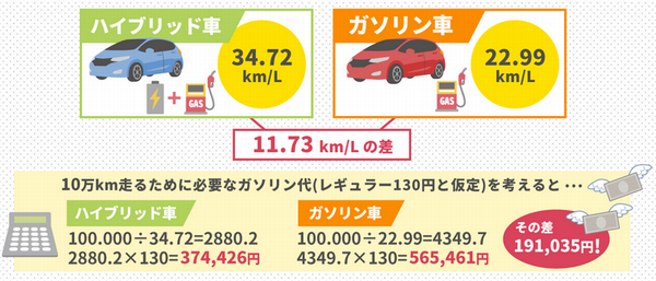 ハイブリッド車の燃料代は、ガソリン車よりも大きく抑えられます。