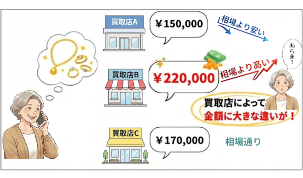 金の買取価格は業者によっても様々です。同じ品物でも買取店Aでは15万円、買取店Bでは22万円——そんな差が実際に起きています。