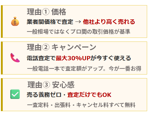 今なら買取手数料が無料に加え、電話相談だけで買取額30%UPキャンペーンを実施中ですので、他店を圧倒する高値での買取が期待できます。