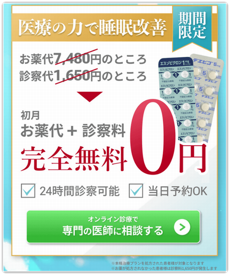 不眠症の中でも、一番多い症状である入眠障害の方に処方のデエビゴであれば、睡眠薬代(7,480円)+診察費(1,650円)の9,130円が今だけ完全無料でお得に利用できます。