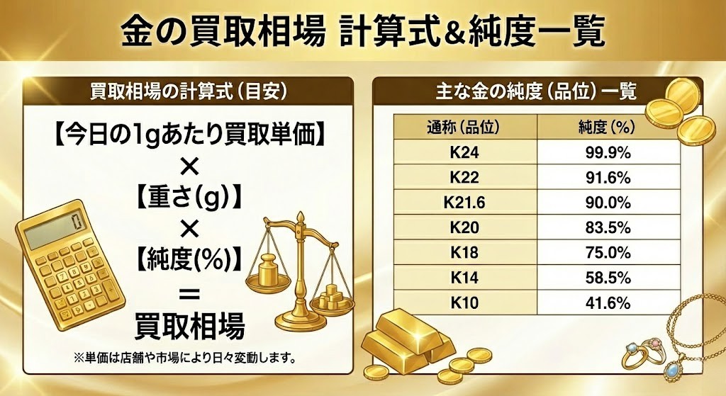 もし純度が分かる場合は、自分で買取相場を計算しておく事で足元を見られず納得の金額で売却できます。