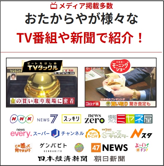 おたからやは信頼実績高価買取で報道番組で特集を組まれたり、多くのメディアで注目を集めています。