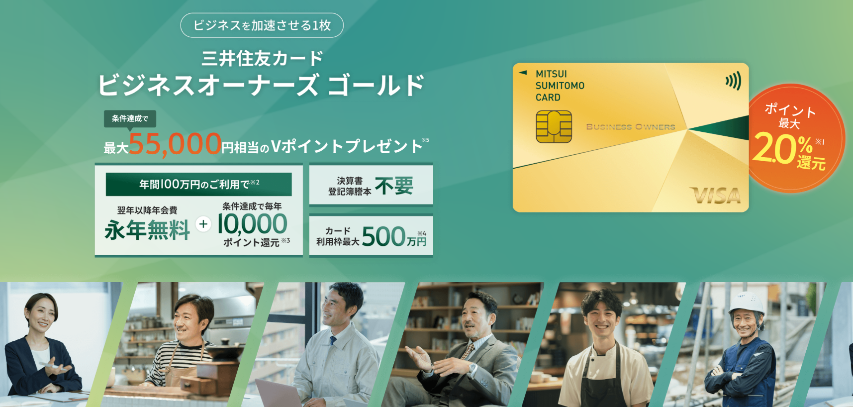 三井住友カードビジネスオーナーズゴールドは銀行系ならではの安心感に加え、対象店舗で最大2.0%の高還元率を実現。日常の経費支払いでもしっかりポイントが貯まります。また年間100万円の利用で翌年以降の年会費が永年無料になります。経理・管理ツールとの連携機能も充実しており、経費処理の効率化とリスク管理を同時に叶えられる優秀な1枚です。