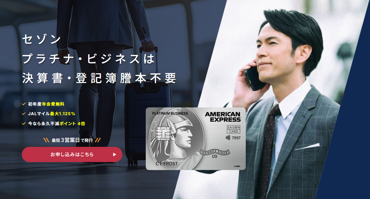 セゾンプラチナ・ビジネスAmexは初年度年間日無料に加え、プラチナ特典も充実しており、国内外の出張や経費決済をスマートにサポートします。また法人代表者だけでなく、個人事業主でも申し込み可能。経費の支出を個人カードから切り離したいフリーランスにも使いやすい設計です。SAISON MILE CLUB(年会費5,500円)に加入するとJALマイル還元率が1.125%になり、飛行機での出張がある人には特におすすめのカードです。