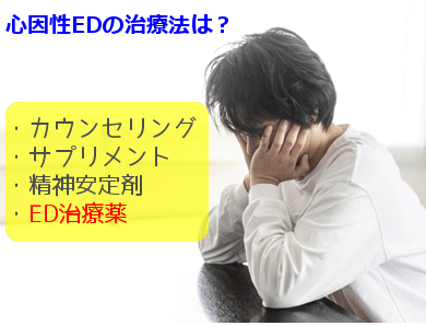 心因性EDの治療・改善方法としてはED治療薬以外で言えば、カウンセリング、サプリメント、精神安定剤の利用が一般的。