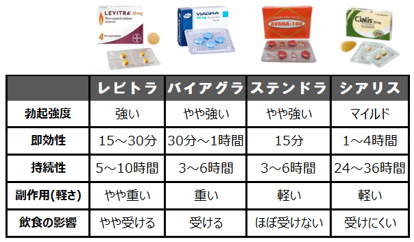 まずは知名度のあるバイアグラを安く試したい、勃起強度ならレビトラ、効果持続を求めるならシアリス。などのように症状や作用に合わせて選べます。