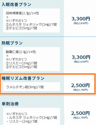 また、とにかく安くはじめてみたいという場合であれば、睡眠薬だけの単剤プラン「睡眠リズム改善プラン」も良心的です。