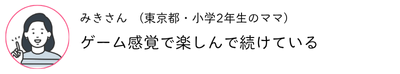 勉強が苦手で机に向かうのを嫌がっていましたが、「まなびクエスト」で遊びながらポイントを貯めるのが楽しいようです。貯めたポイントで“努力賞”のごほうびを選べるのも楽しみのひとつみたいで、今では「今日のクエスト終わった?」が毎日の会話になっています。