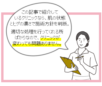 ‥デメリットを上げるなら、「前回ヒゲ脱毛したときの日付と照射レベルを元に施術するため、クリニックが変わればそのデータが参照できないこと。」