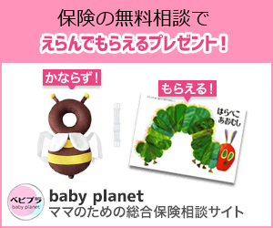 妊娠20週目で入れる保険を探しいる時にベビープラネットで月1,700円のプラン紹介してもらえて「安い!」って即決。産後に解約する予定だったのでトータルで1万円以内で済みました。1万円で安心を買えますので入っておくのは本当にオススメごり押しの勧誘覚悟だったけど拍子抜けするくらい全く無くて、もらった資料をみて家でゆっくり検討できました。プランナーさんが本当に親切丁寧でわかりやすく具体的に説明してくれて他ではもらえないプレゼントも嬉しかったな。