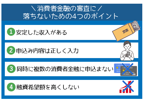 審査では他社での借入や収入、信用情報などを調査していますが、以下4つのポイントを満たしていれば審査に通過しやすいと言えます。